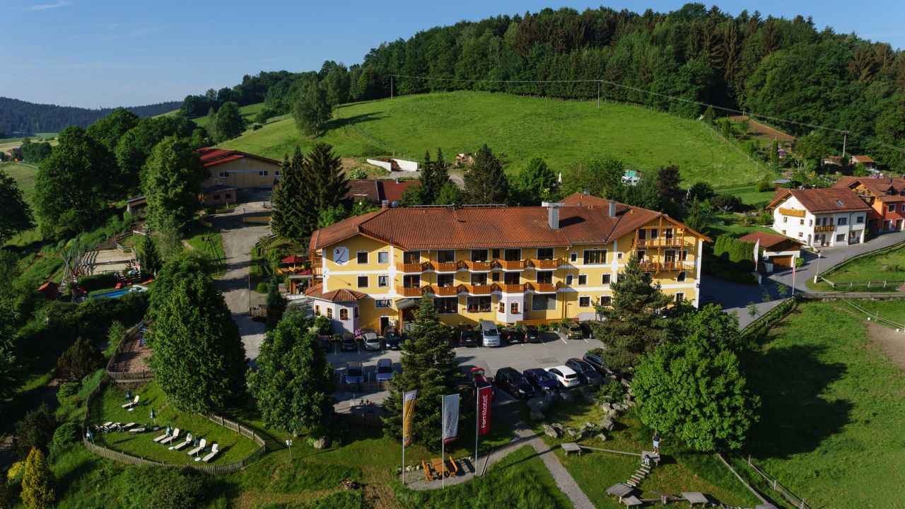 Die Lage: Du findest das 4‑Sterne Superior Familotel in Alleinlage auf 14 Hektar Natur hinter dem Berg, mit eigenem Wald, Wiesen und Bach – ideal für Naturerlebnis pur. Kleinere Ortschaften wie Schönberg sind nur wenige Kilometer entfernt, ebenso spannende Ausflugsziele wie Nationalpark Bayerischer Wald, Pullman City oder die Stadt Passau.