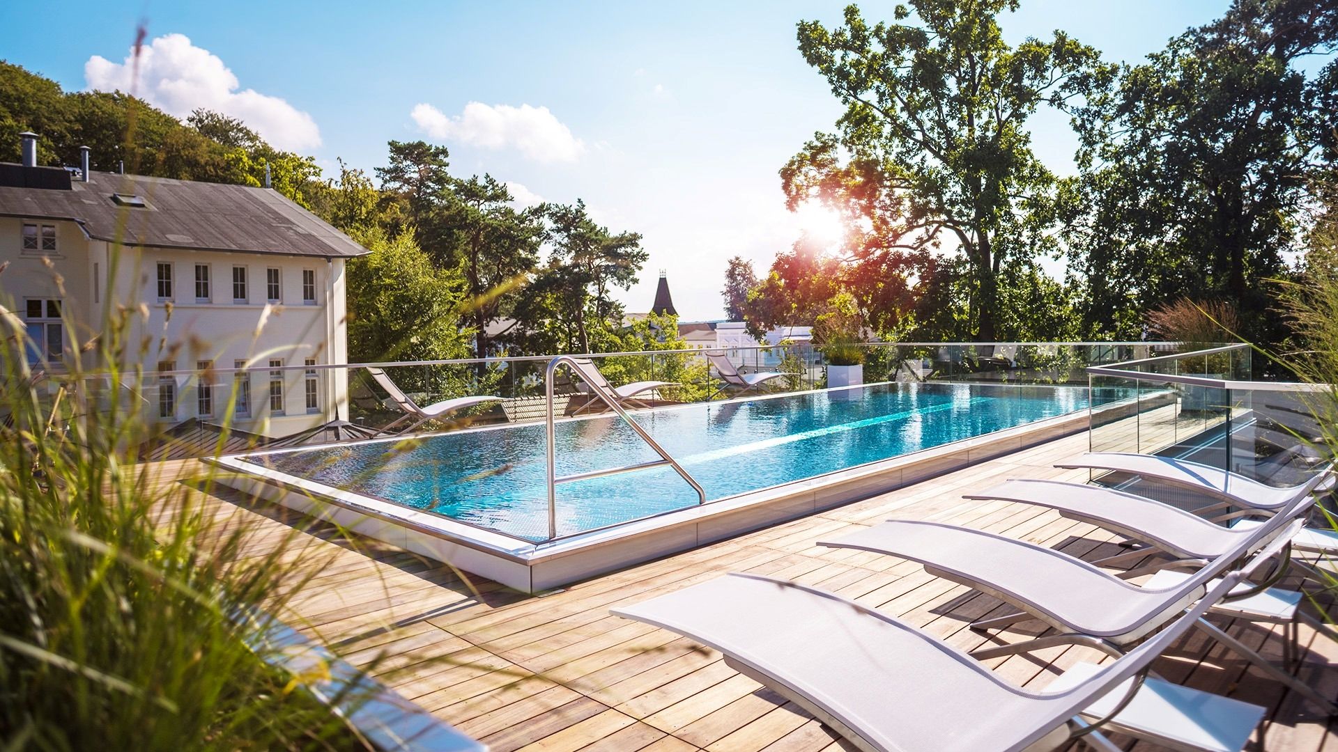 Ein besonderes Highlight des Hotels ist der exklusive Spa- und Wellnessbereich. Wer Entspannung auf Rügen sucht, wird hier fündig. Das großzügige Spa umfasst unter anderem einen beheizten Außenpool auf dem Dach mit Panoramablick, mehrere Saunen, ein Dampfbad sowie stilvolle Ruheräume. Der Blick über die Dächer von Sellin bis hin zur Ostsee macht jeden Wellnessmoment zu einem besonderen Erlebnis.