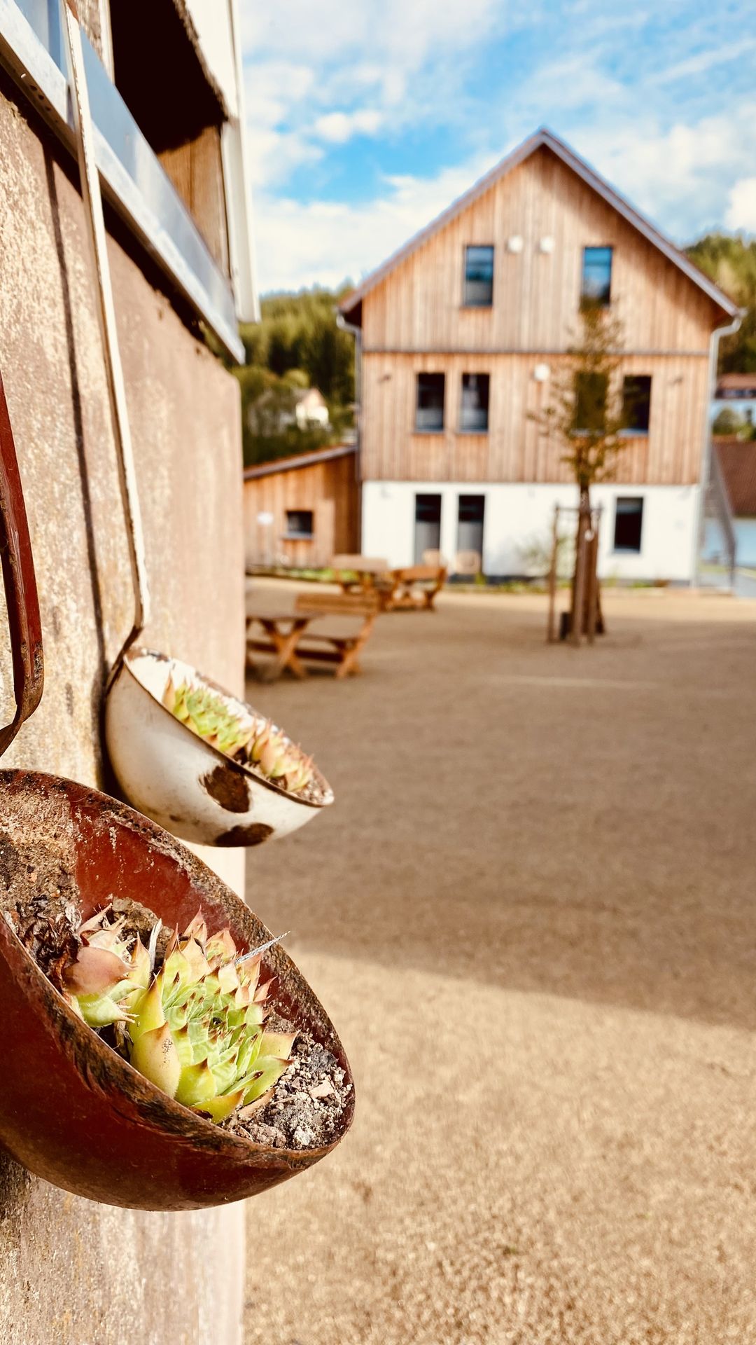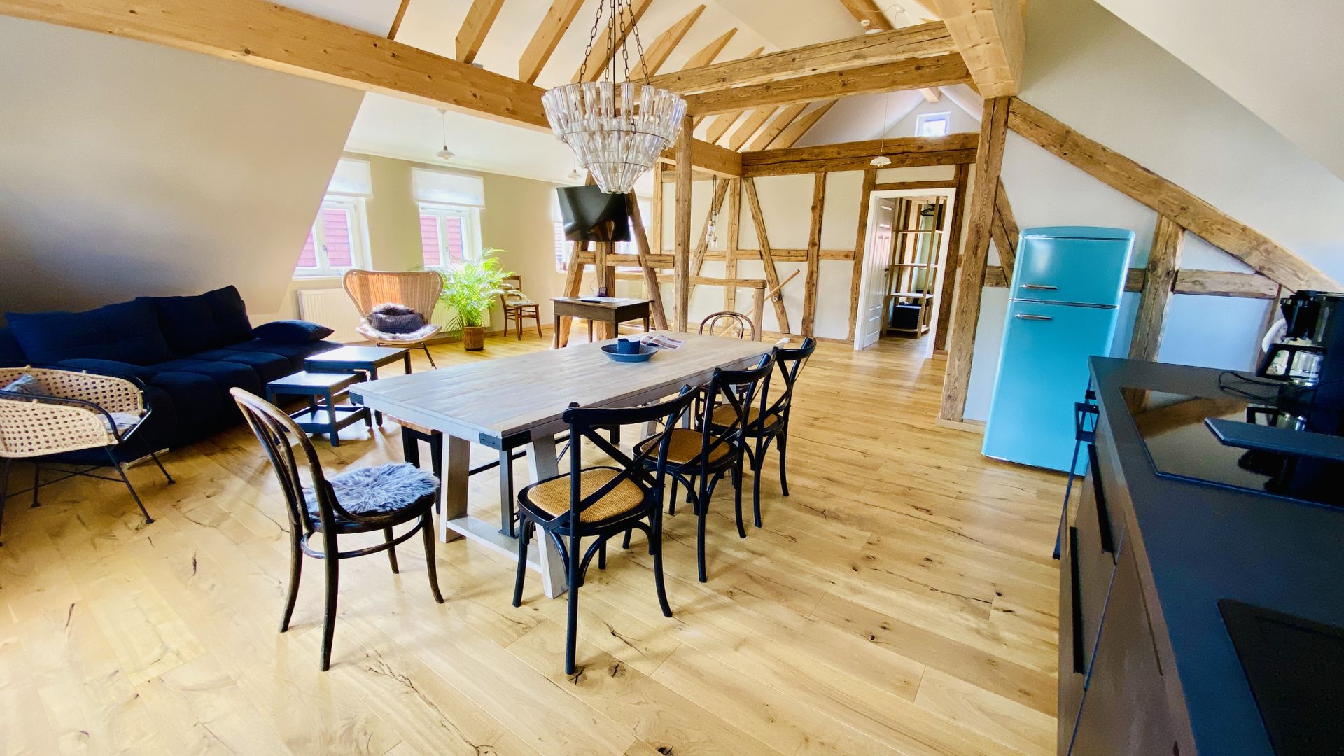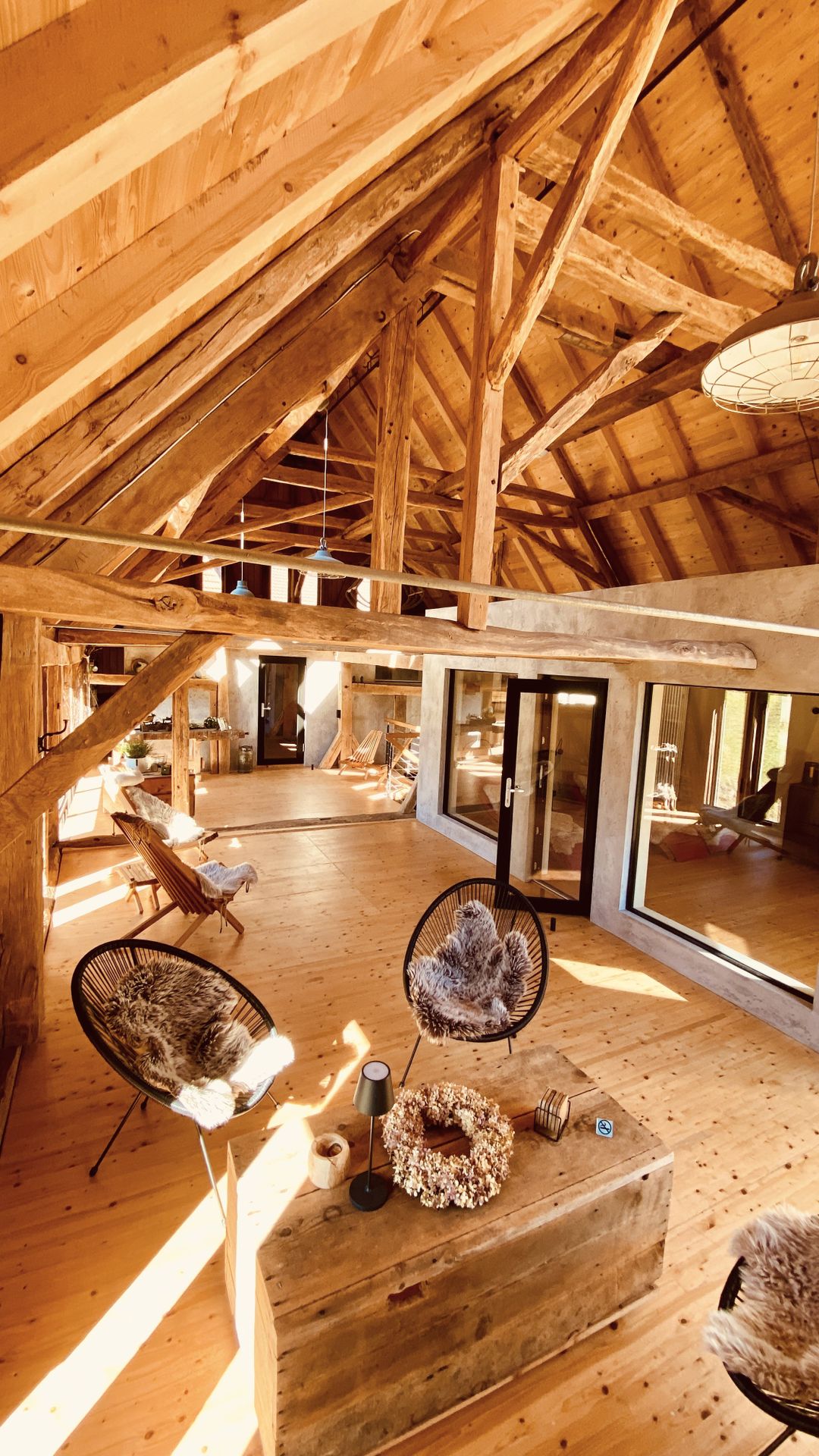 Ein besonderes Element des Hofs ist die Saunascheune, die 2025 mit dem Hessischen Denkmalschutzpreis ausgezeichnet wurde. Unter dem alten Gebälk finden sich Sauna, Ruheraum und ein kleiner Balkon mit Blick ins Grüne – ein Ort zum Abschalten und Ankommen.
