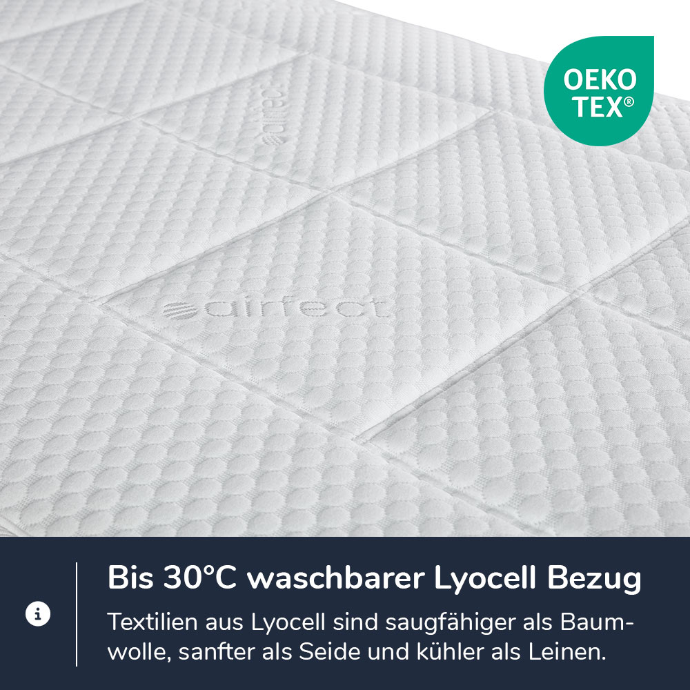 Der Bezug der airfect® Matratze Prestige Spring ist nicht nur praktisch – er ist hygienisch und sorgt dazu für echten Komfort. Hergestellt aus einem innovativen Materialmix, ist er atmungsaktiv, samtweich und besonders hautfreundlich, sodass du die ganze Nacht über frisch, trocken und wunderbar bequem liegst. Das Material passt sich an deinen Körper an, sorgt für ein perfektes Schlafklima und lässt dich jeden Morgen erholt aufwachen.