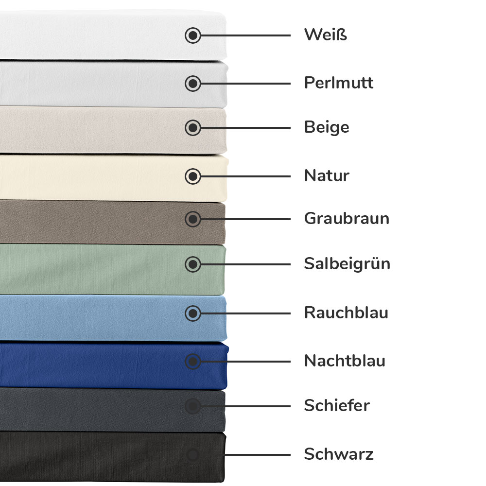 Das Spannbetttuch ist bei uns im Shop in zehn dezenten Farben erhältlich, die deinem Schlafzimmer eine elegante und harmonische Atmosphäre verleihen. Von sanftem Salbeigrün über Rauchblau bis hin zu schlichtem Beige kannst du aus einer Palette von Tönen wählen, die sich mühelos in dein Raumkonzept einfügen und dabei für einen stilvollen Akzent sorgen.