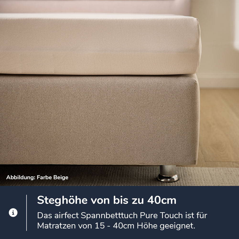 Gestalte dein Schlafzimmer nach deinen Wünschen: wähle das airfect® Pure Touch Spannbetttuch in der perfekten Größe und Farbe für dein Bett aus. Es ist in drei Größen erhältlich, sodass du das passende Spannbetttuch für dein Bett auswählen kannst, ob Einzelbett oder großes Doppelbett. Mit einer komfortablen Steghöhe passt sich das Spannbetttuch ideal an Matratzen unterschiedlicher Größen an – auch an Boxspring- und Wasserbetten.